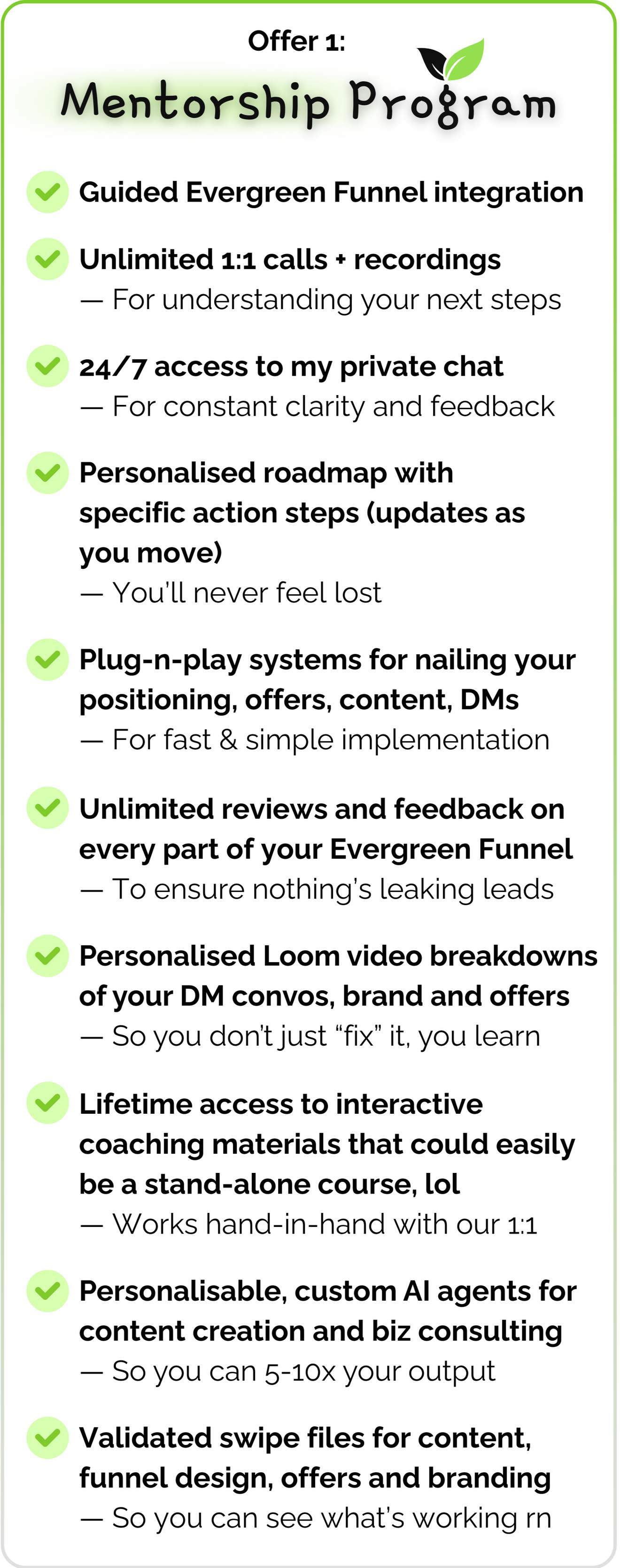 I don't promise numbers (like 500 followers in 30 days). I promise systems that ATTRACT results. It's more like “before you didn't have this working for you 24/7, now you do”. How much growth/followers/revenue increases is dependent on your level of commitment and niche and honestly - a bit of luck. But I CAN promise an increase in all of those ;)